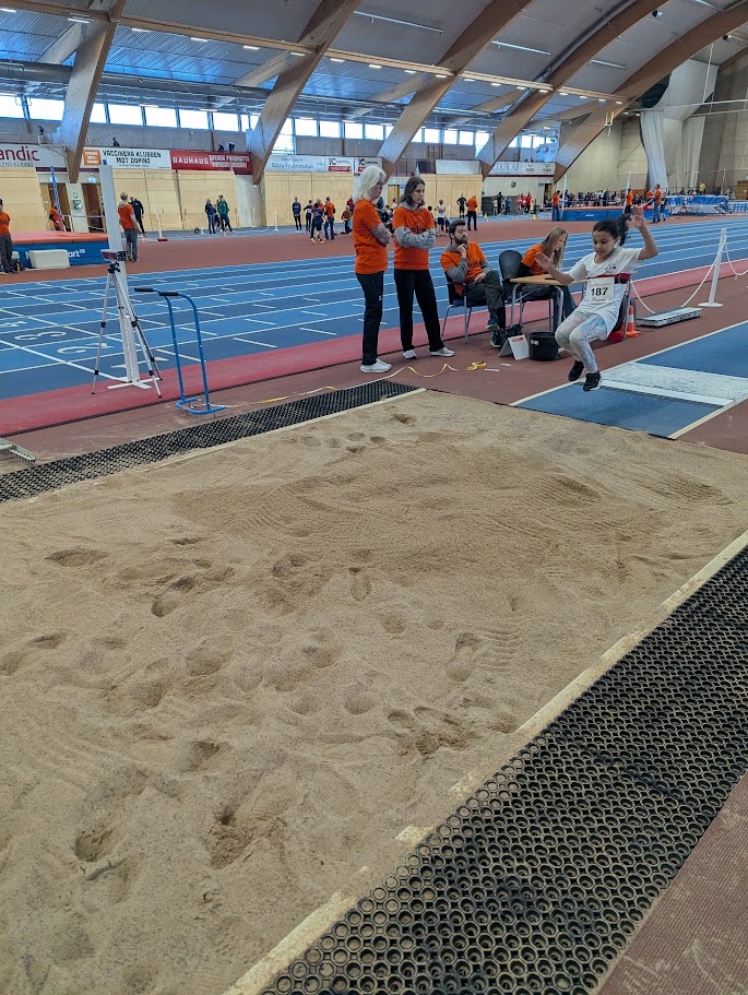 Ines Soltna i Flickor 10 år flyger in i sandgropen i längdhoppet.