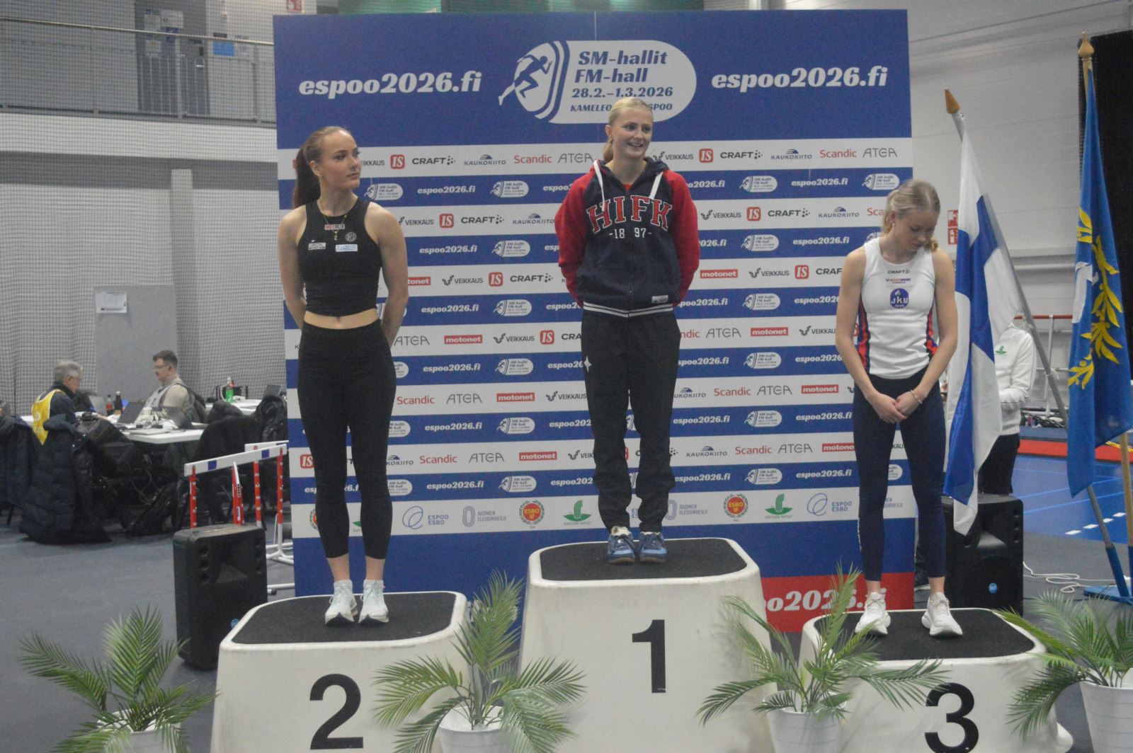 Nora överst på prispallen efter segern på 200 meter i Finska Mästerskapen.