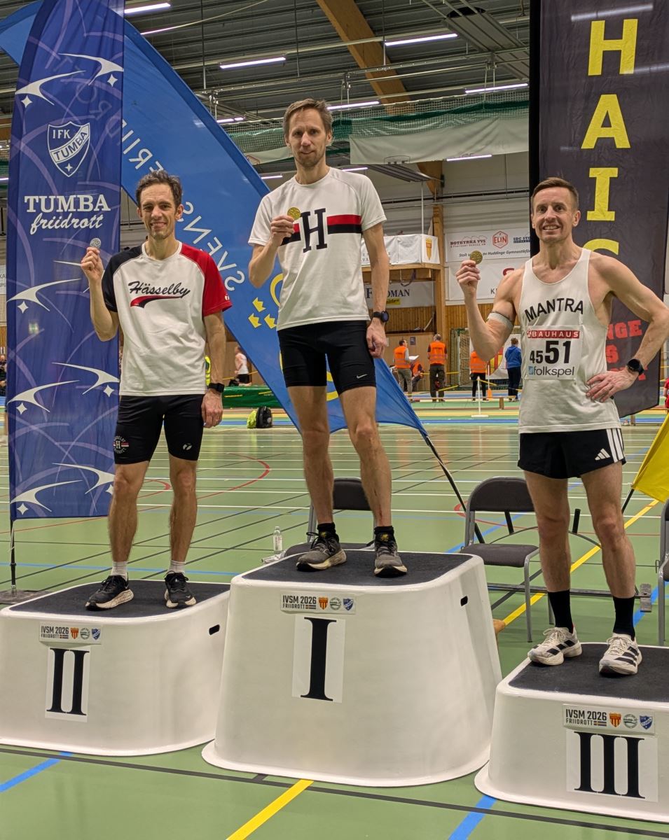 Prispallen på 3000 meter. Hässelby etta och tvåa. Martin Öhman på överst på prispallen efter sitt svenska rekord på distansen och Rickard Pell på en fin andra plats. Foto Jennie Lind.